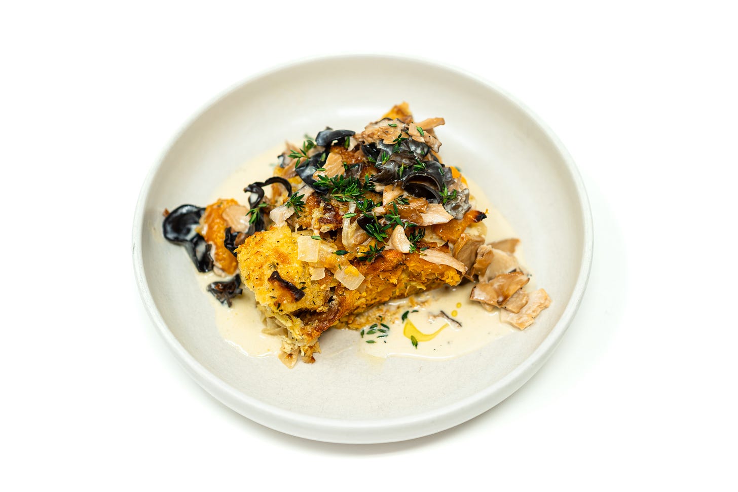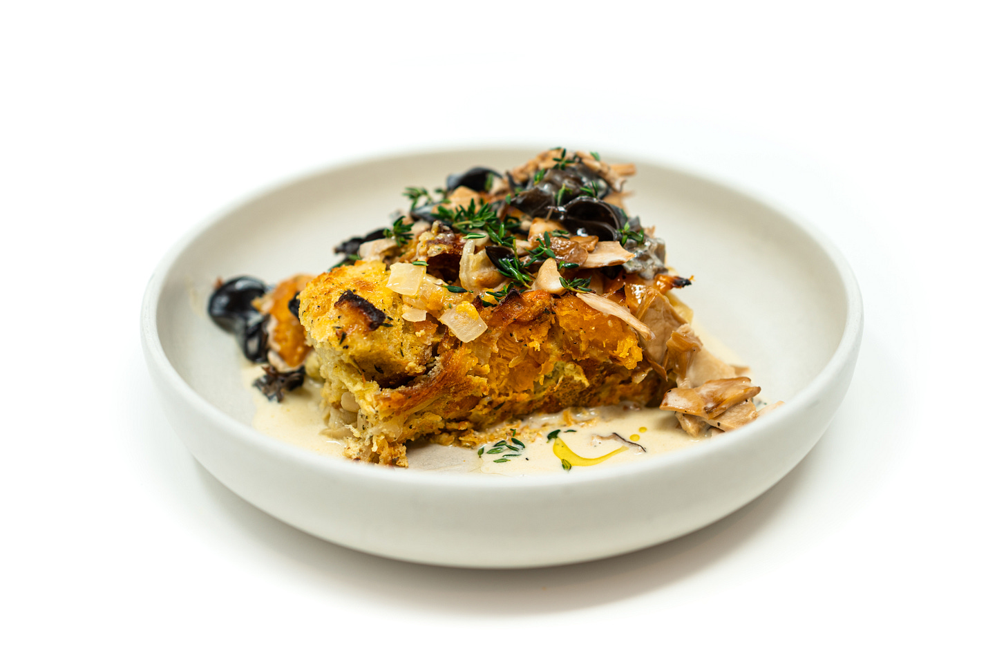 Butternut Squash Ciabatta Bread Pudding with Wild Mushroom Cream