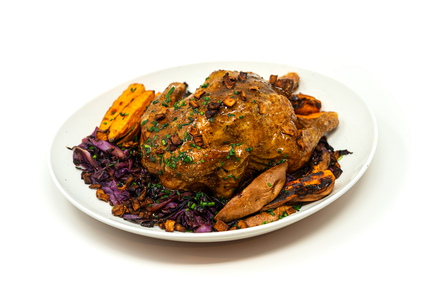 The best part is the finish. As the chicken roasts, its juices drip down into the broth. We reduce that mixture into a glossy, dairy-free jus that beats most gravies.